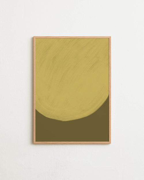 Art print with a minimalist illustration of a large, rounded color field in a yellow tone against a green background. Styled in a minimalist interior.