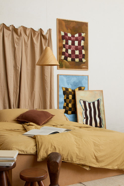 Art prints av Hanna Peterson. Pillow Love är ett kärleksbrev till kudden – vår mest självklara följeslagare. Rutig, randig, gingham eller enfärgad, oavsett överdrag är det kudden som ger oss ro varje natt, den mjuka plats där drömmar tar form.