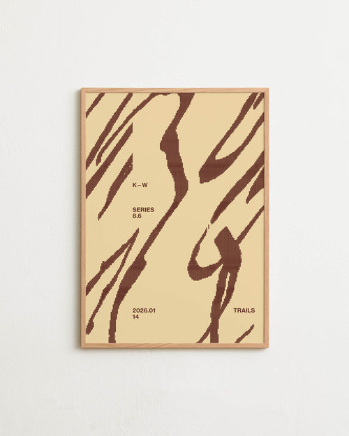 Art print featuring a minimalistic motif in warm brown and soft beige, with shapes that explore the space between abstraction and recognition through soft, fluid forms. Styled in a minimalist interior.
