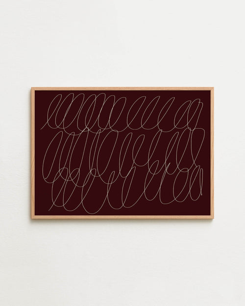 Art print with a graphic illustration of sweeping, continuous lines in a light tone against a wine-red background, with a minimalist and abstract expression. Styled in a minimalist interior.